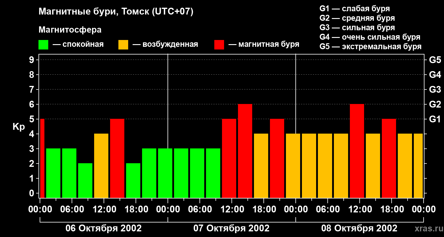 Изменения геомагнитного индекса Kp с 6 по 8 октября 2002 года для средних широт