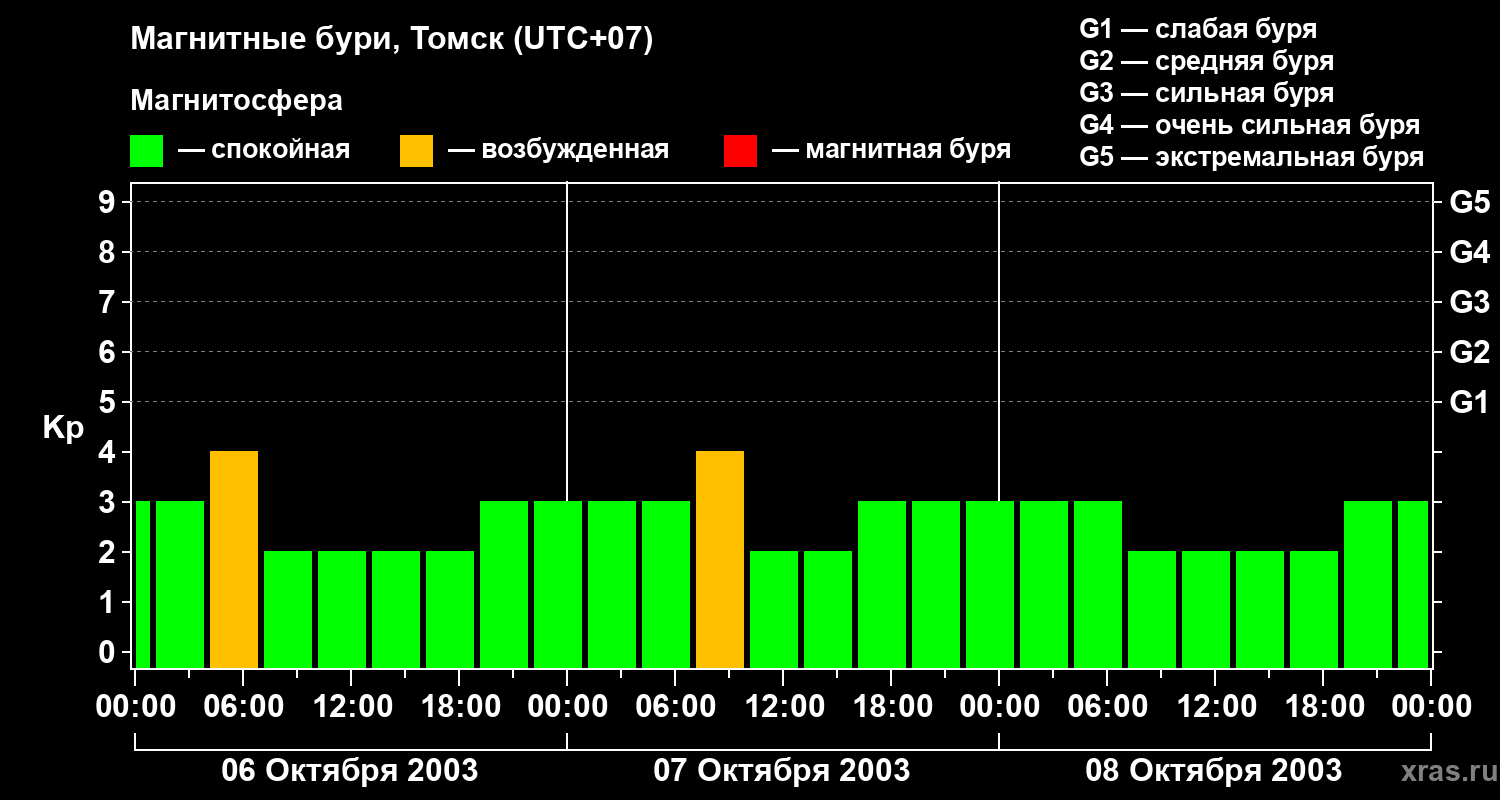 Изменения геомагнитного индекса Kp с 6 по 8 октября 2003 года для средних широт