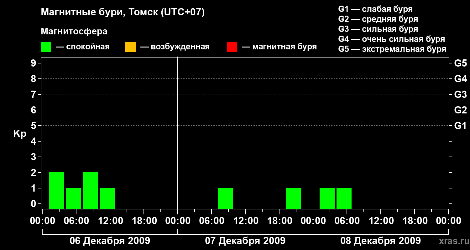 Изменения геомагнитного индекса Kp с 6 по 8 декабря 2009 года для средних широт