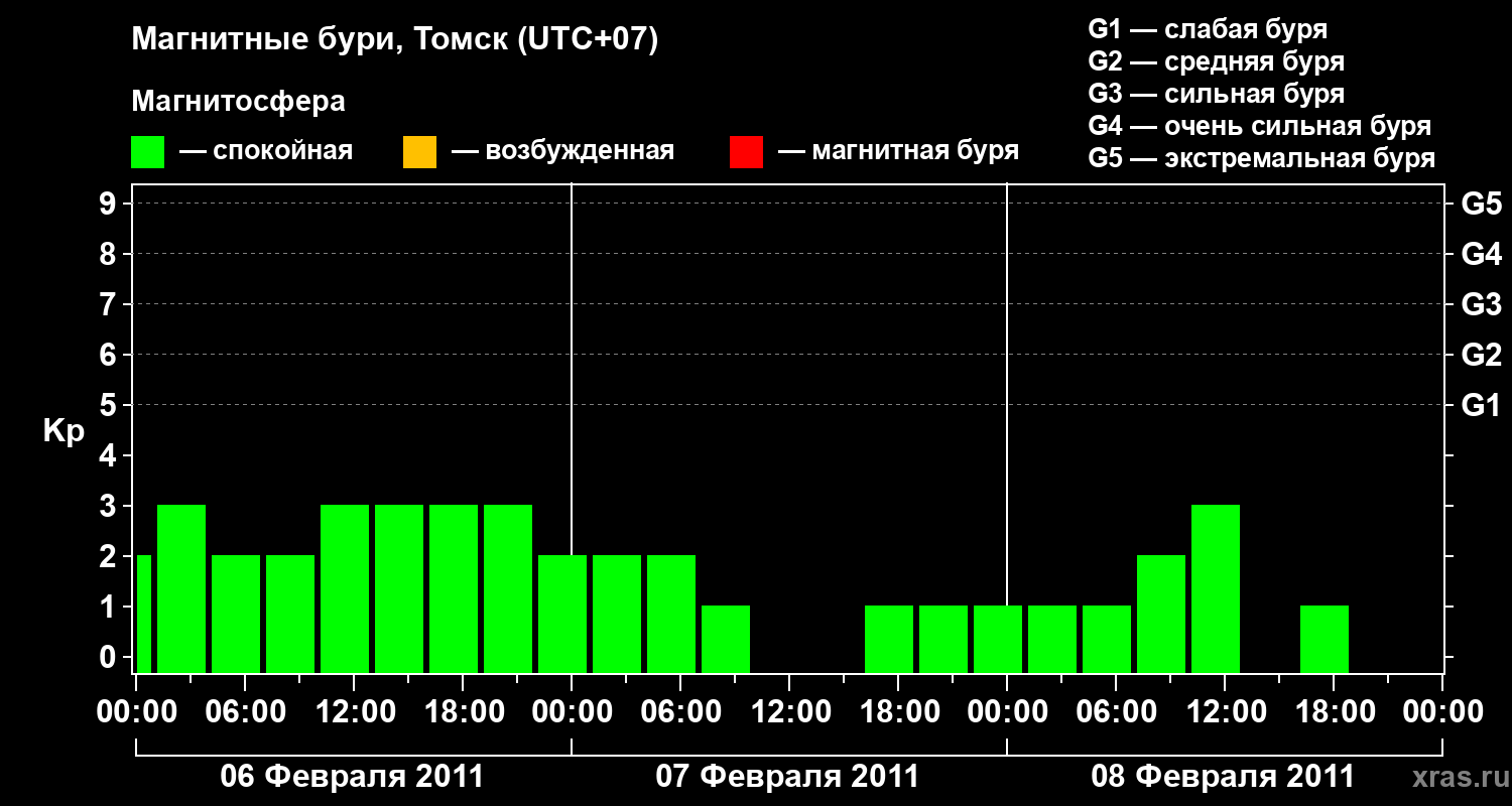 Изменения геомагнитного индекса Kp с 6 по 8 февраля 2011 года для средних широт