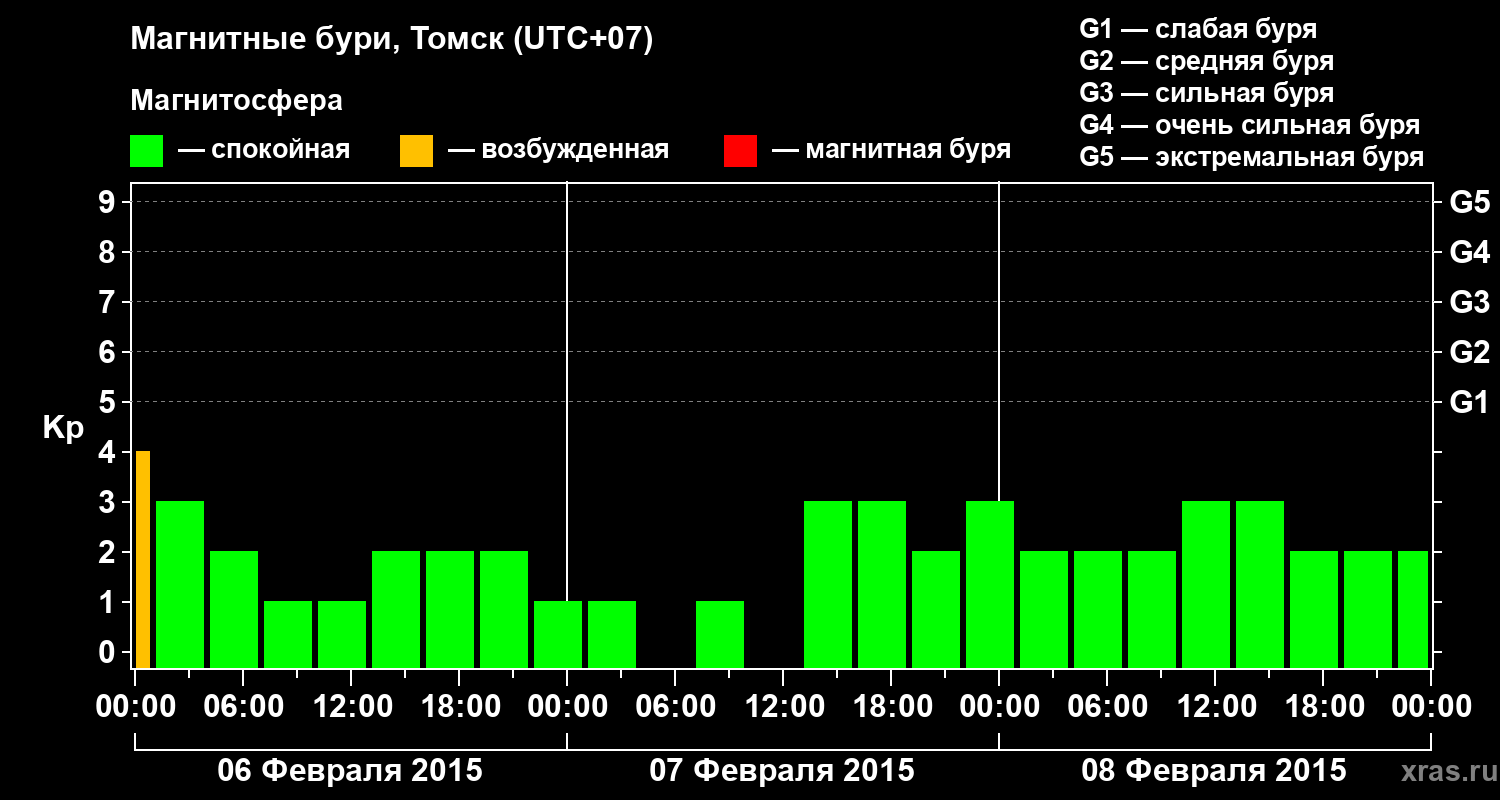 Изменения геомагнитного индекса Kp с 6 по 8 февраля 2015 года для средних широт