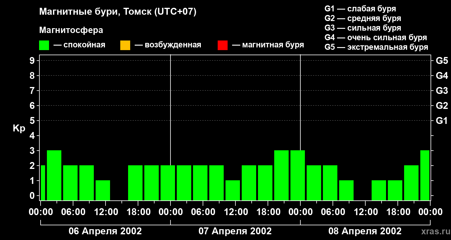 Изменения геомагнитного индекса Kp с 6 по 8 апреля 2002 года для средних широт