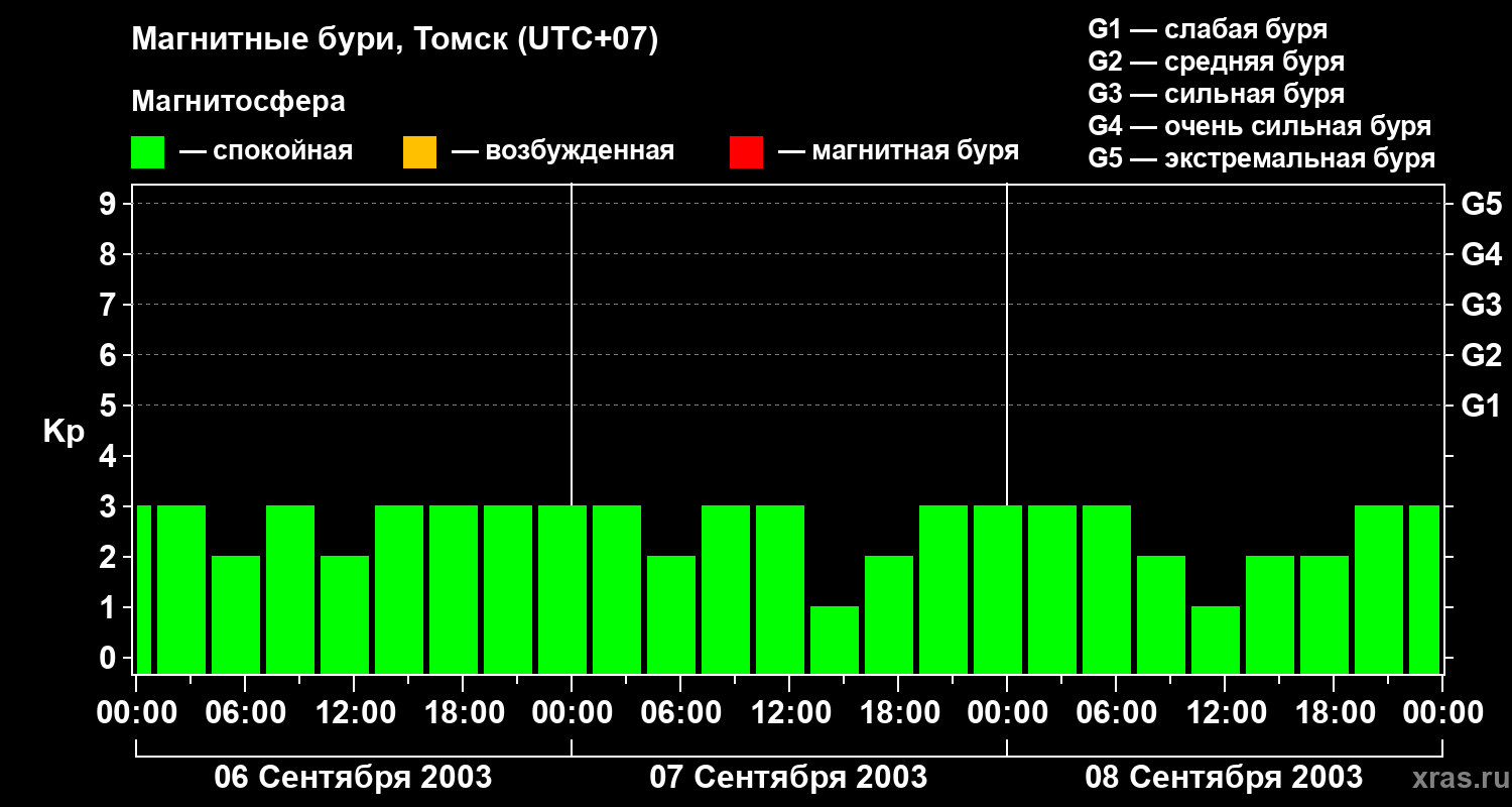 Изменения геомагнитного индекса Kp с 6 по 8 сентября 2003 года для средних широт