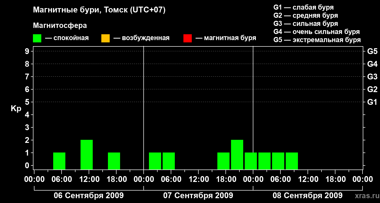 Изменения геомагнитного индекса Kp с 6 по 8 сентября 2009 года для средних широт