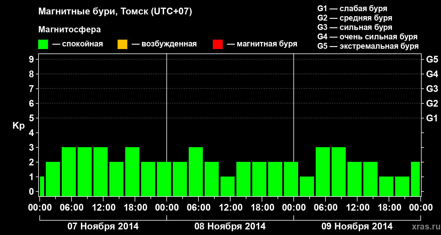 Изменения геомагнитного индекса Kp с 7 по 9 ноября 2014 года для средних широт