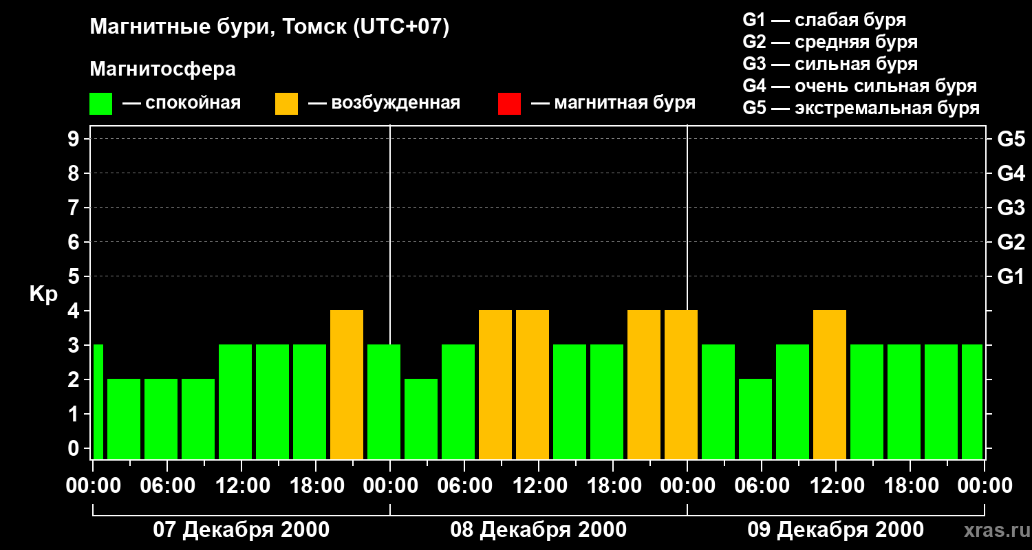 Изменения геомагнитного индекса Kp с 7 по 9 декабря 2000 года для средних широт