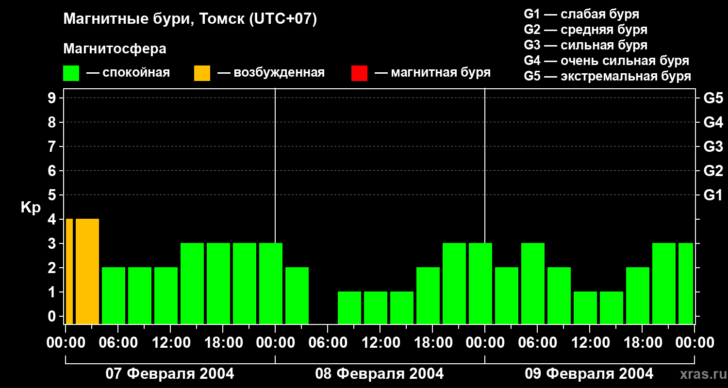 Изменения геомагнитного индекса Kp с 7 по 9 февраля 2004 года для средних широт