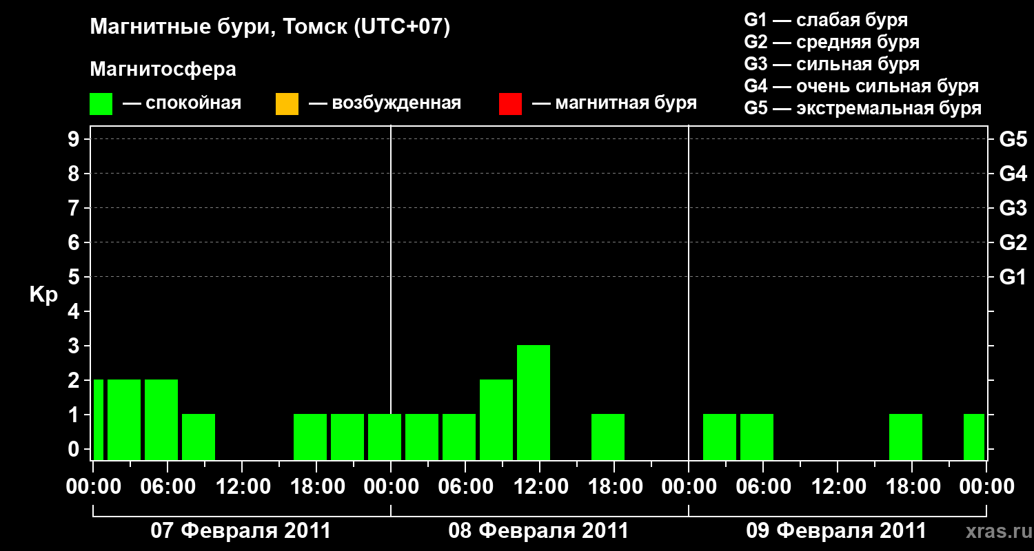 Изменения геомагнитного индекса Kp с 7 по 9 февраля 2011 года для средних широт