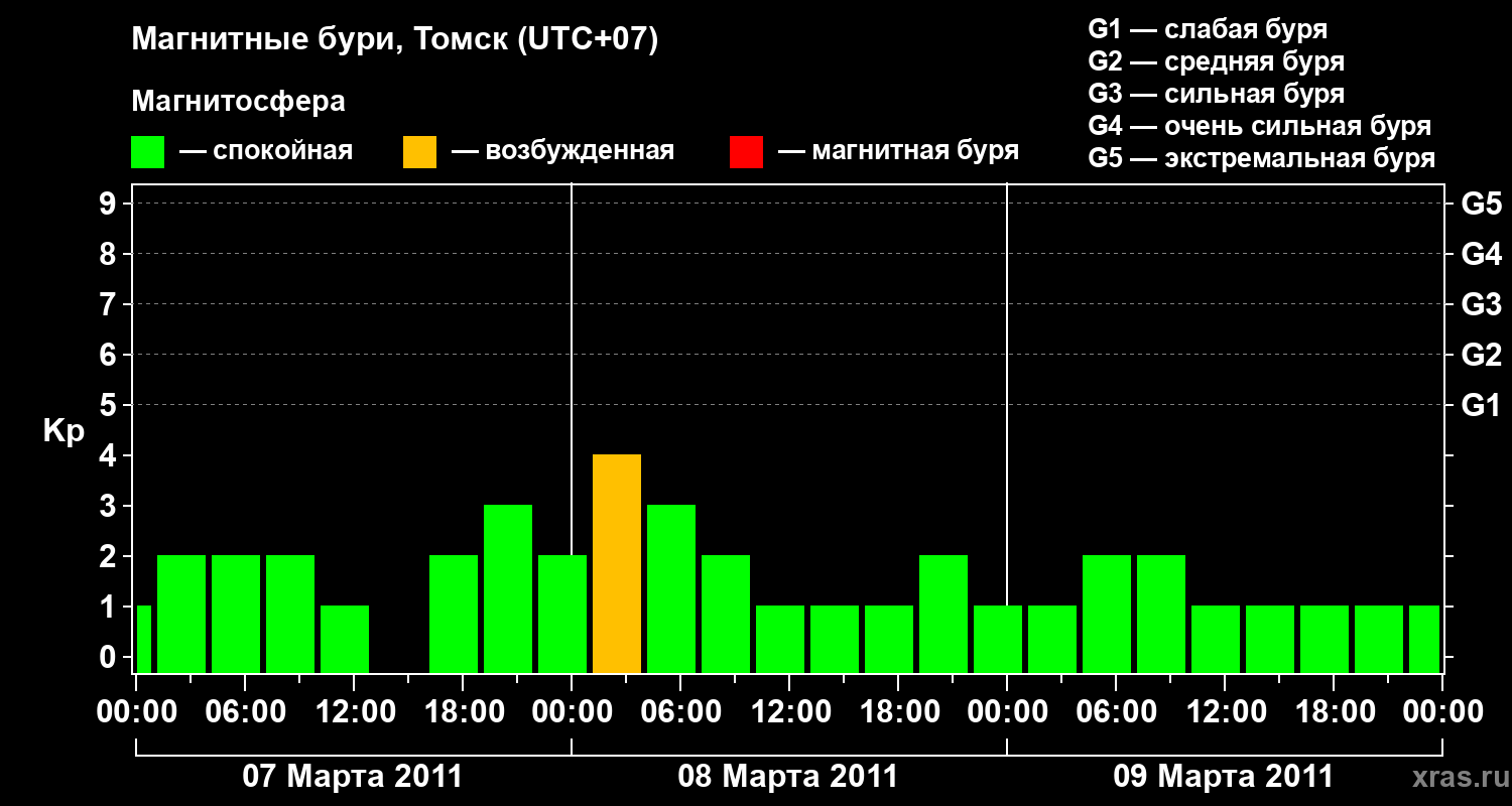 Изменения геомагнитного индекса Kp с 7 по 9 марта 2011 года для средних широт