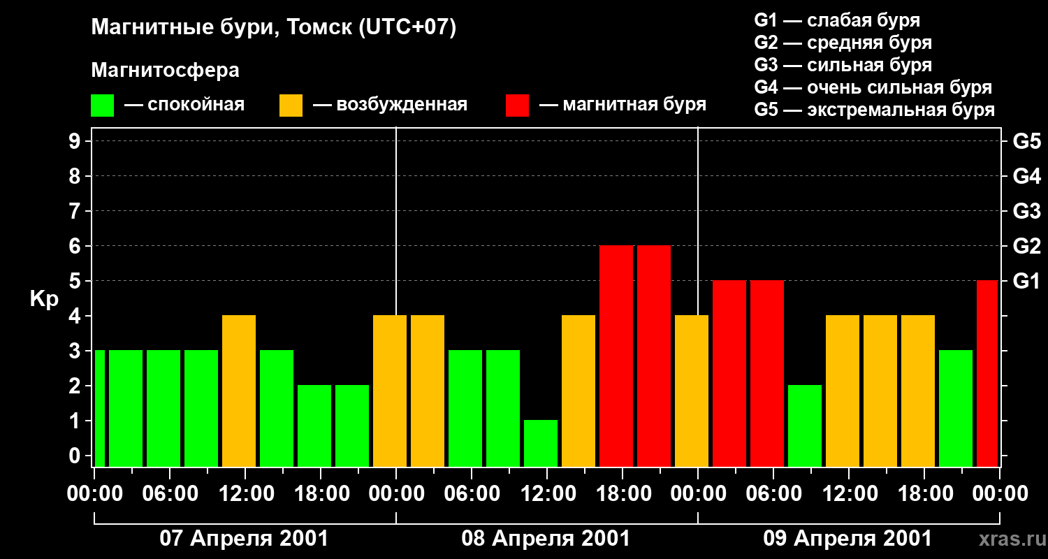 Изменения геомагнитного индекса Kp с 7 по 9 апреля 2001 года для средних широт