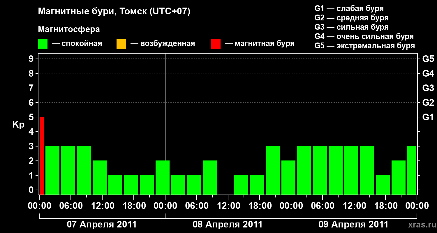 Изменения геомагнитного индекса Kp с 7 по 9 апреля 2011 года для средних широт