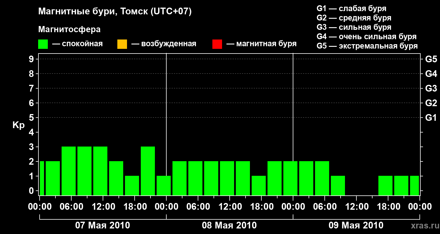 Изменения геомагнитного индекса Kp с 7 по 9 мая 2010 года для средних широт