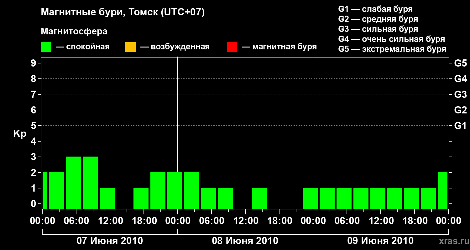 Изменения геомагнитного индекса Kp с 7 по 9 июня 2010 года для средних широт