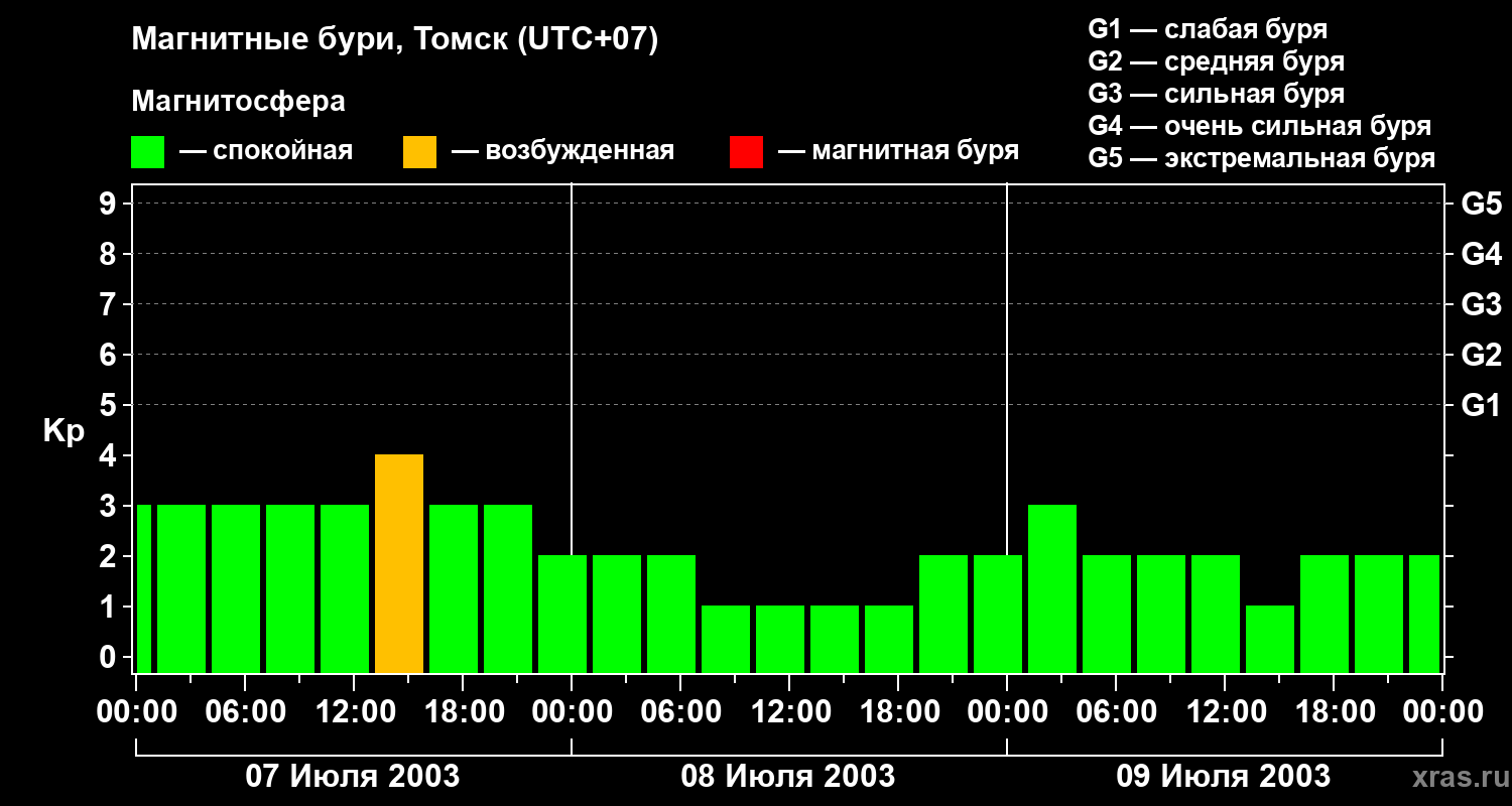 Изменения геомагнитного индекса Kp с 7 по 9 июля 2003 года для средних широт
