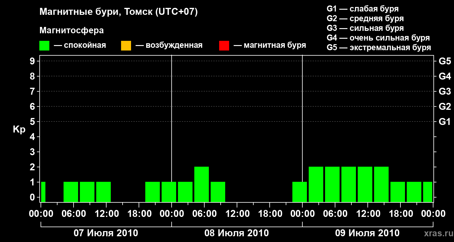 Изменения геомагнитного индекса Kp с 7 по 9 июля 2010 года для средних широт