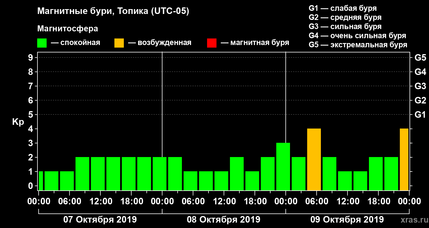 Изменения геомагнитного индекса Kp с 7 по 9 октября 2019 года для средних широт