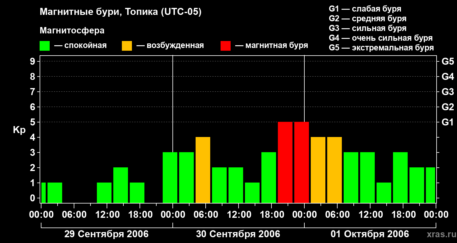 Изменения геомагнитного индекса Kp с 29 сентября по 1 октября 2006 года для средних широт
