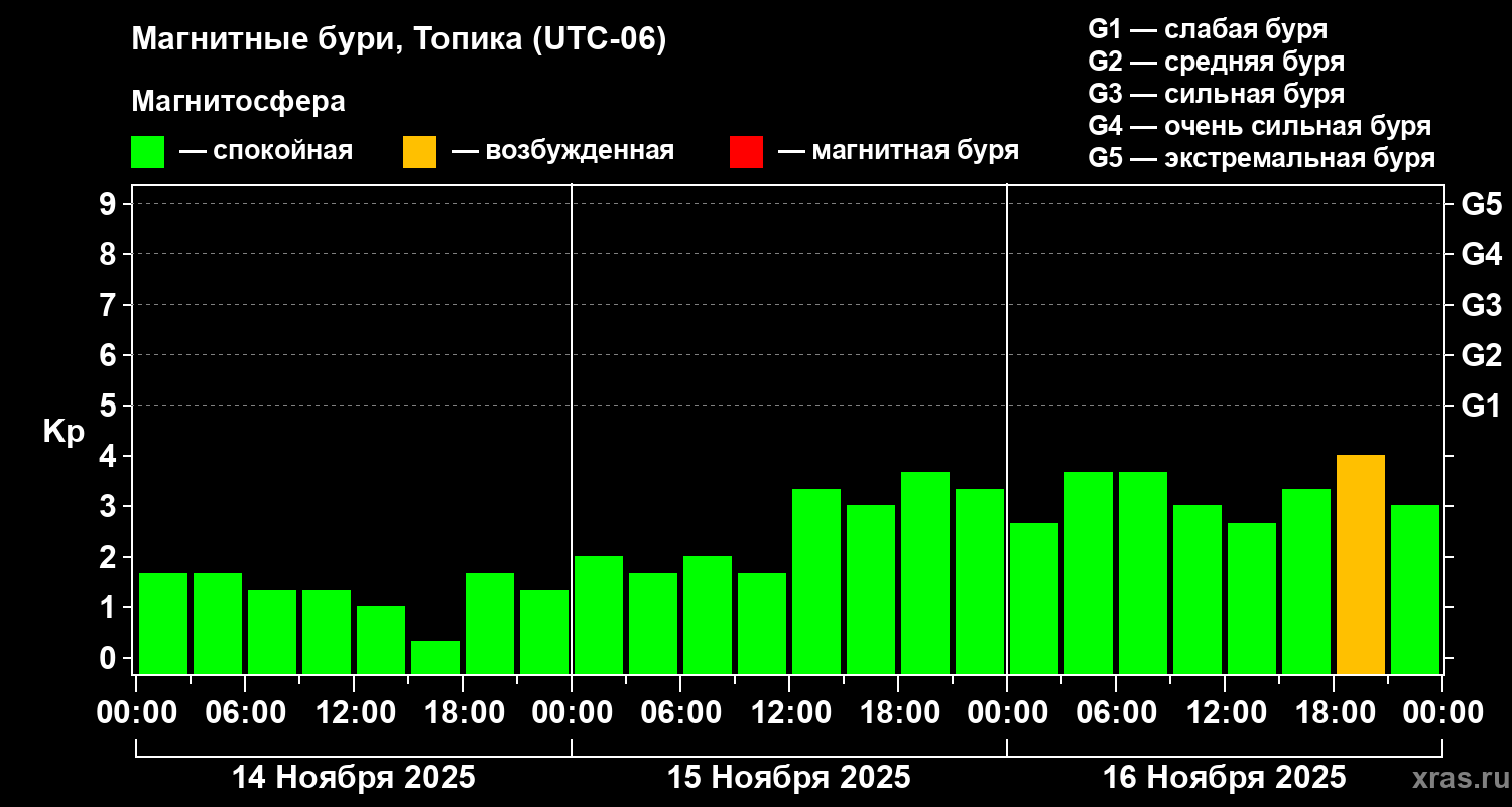 Изменения геомагнитного индекса Kp с 14 по 16 ноября 2025 года для средних широт