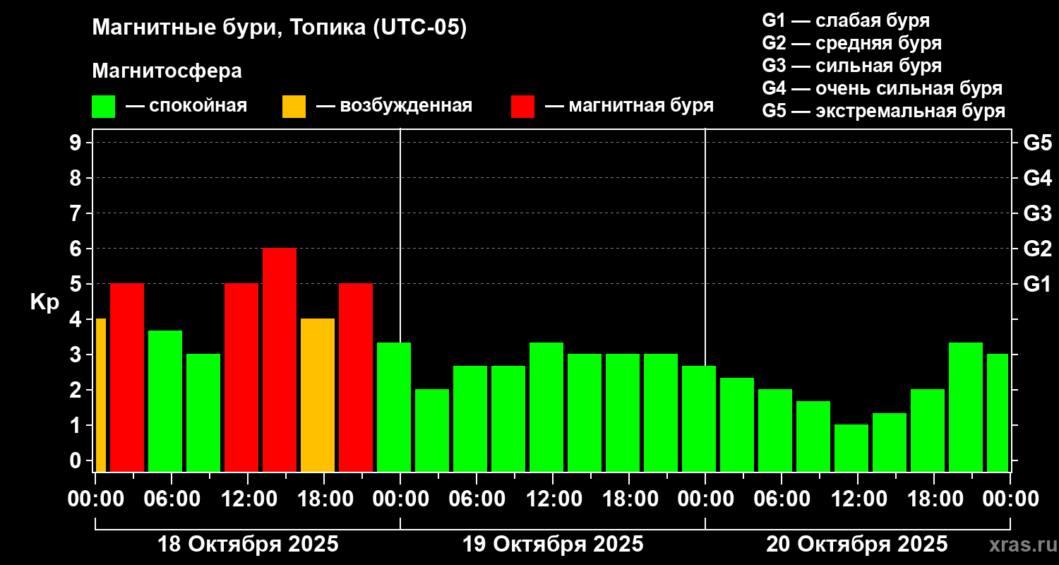 Изменения геомагнитного индекса Kp с 18 по 20 октября 2025 года для средних широт