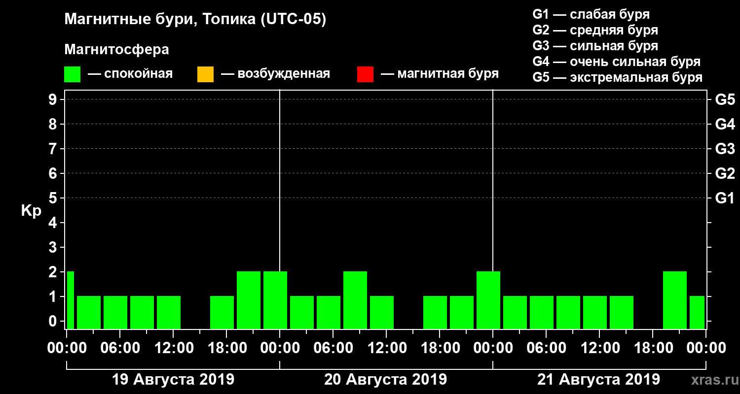 Изменения геомагнитного индекса Kp с 19 по 21 августа 2019 года для средних широт