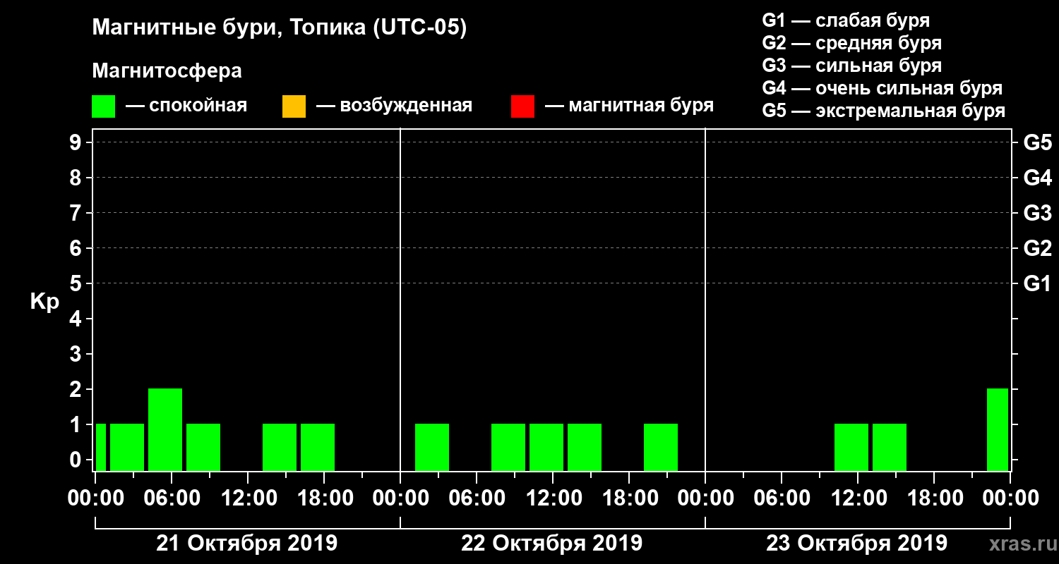 Изменения геомагнитного индекса Kp с 21 по 23 октября 2019 года для средних широт