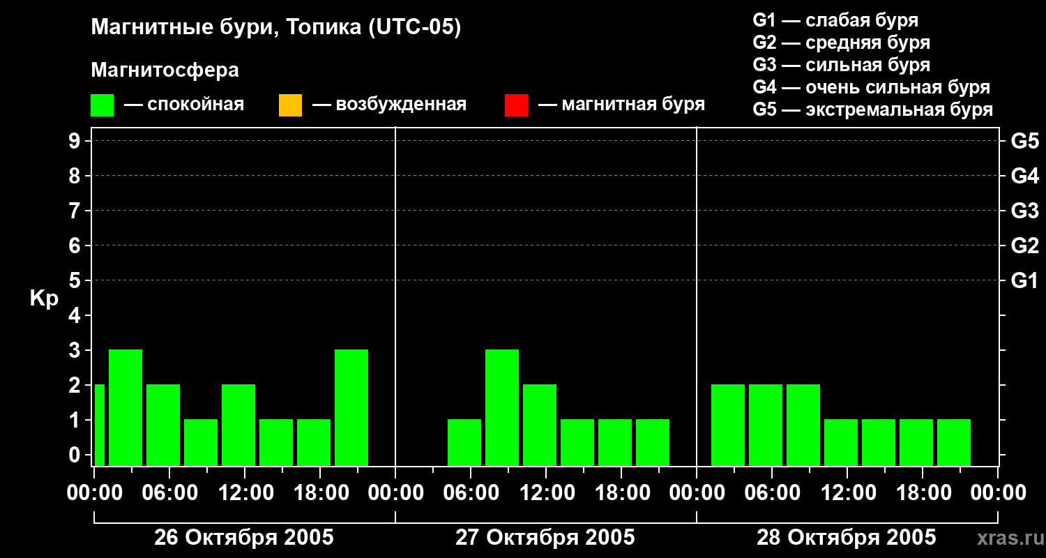 Изменения геомагнитного индекса Kp с 26 по 28 октября 2005 года для средних широт
