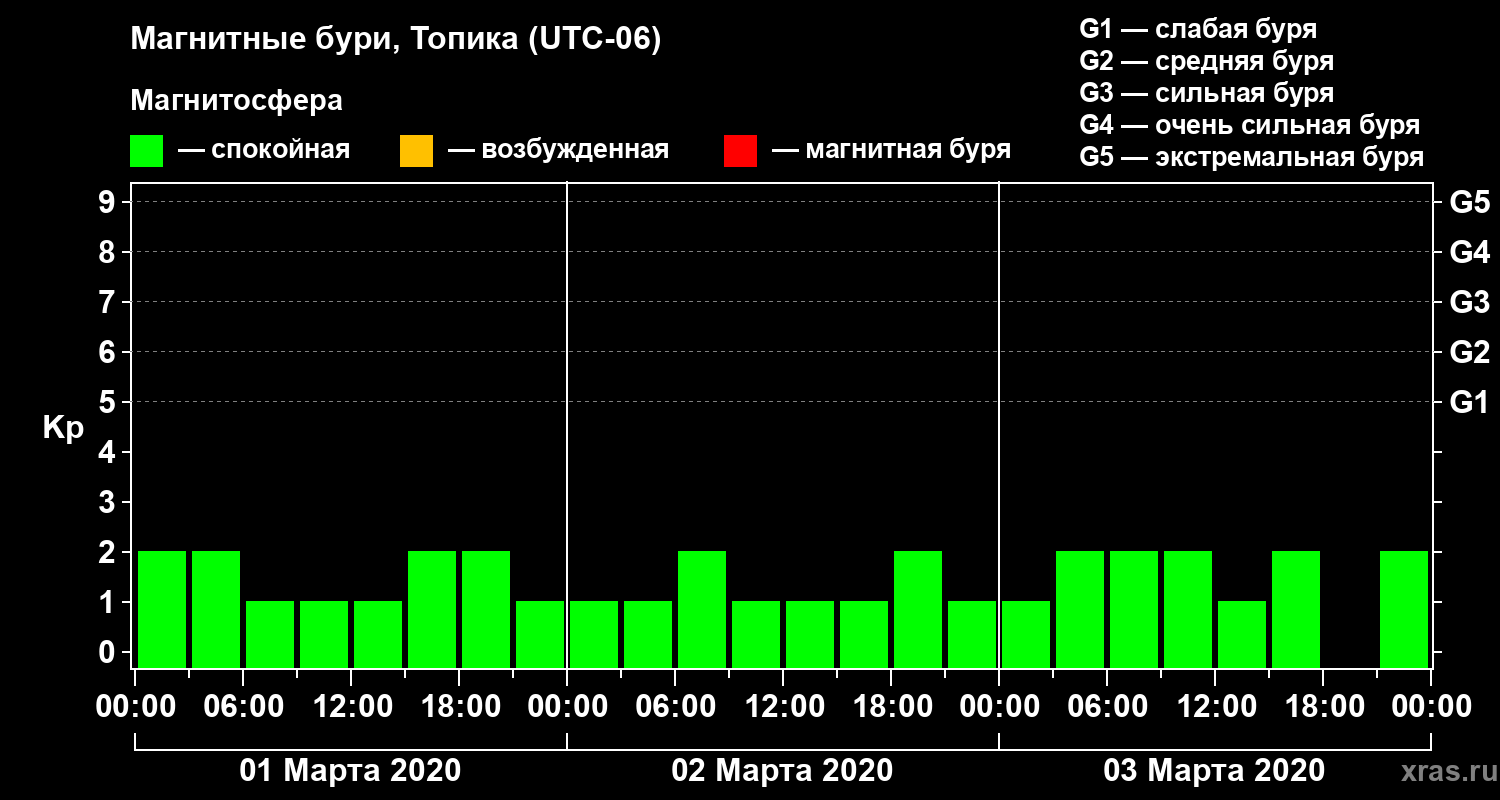 Изменения геомагнитного индекса Kp с 1 по 3 марта 2020 года для средних широт