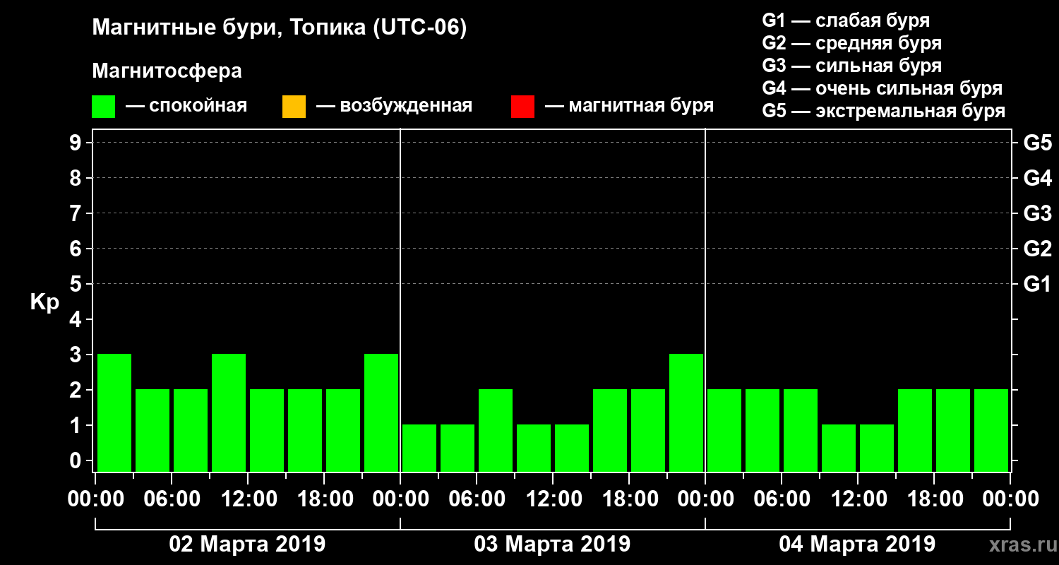 Изменения геомагнитного индекса Kp с 2 по 4 марта 2019 года для средних широт