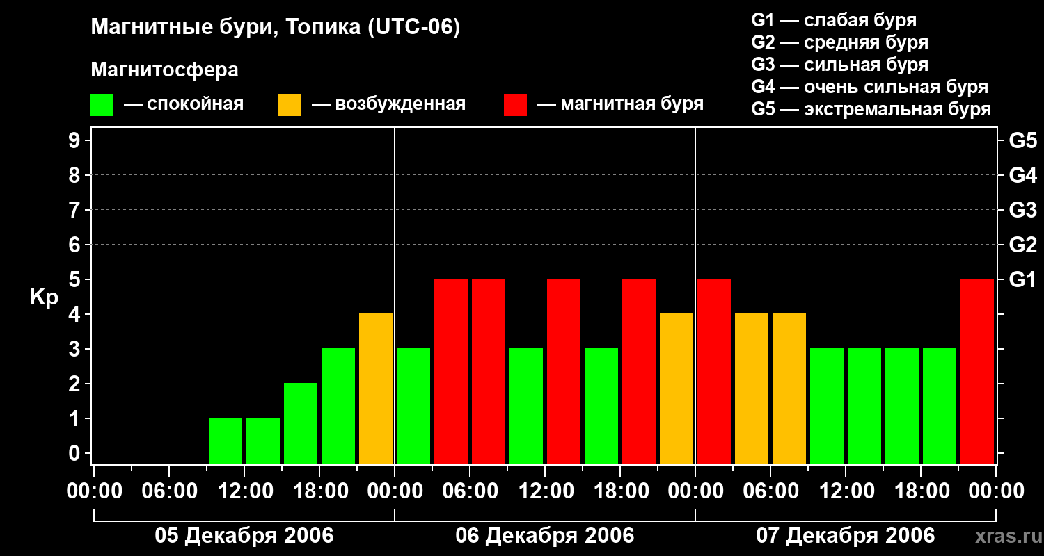 Изменения геомагнитного индекса Kp с 5 по 7 декабря 2006 года для средних широт