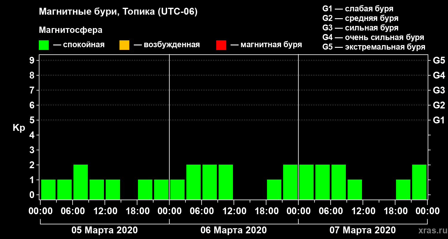 Изменения геомагнитного индекса Kp с 5 по 7 марта 2020 года для средних широт