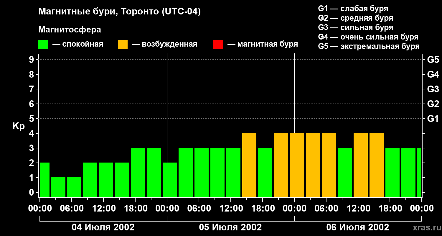 Изменения геомагнитного индекса Kp с 4 по 6 июля 2002 года для средних широт