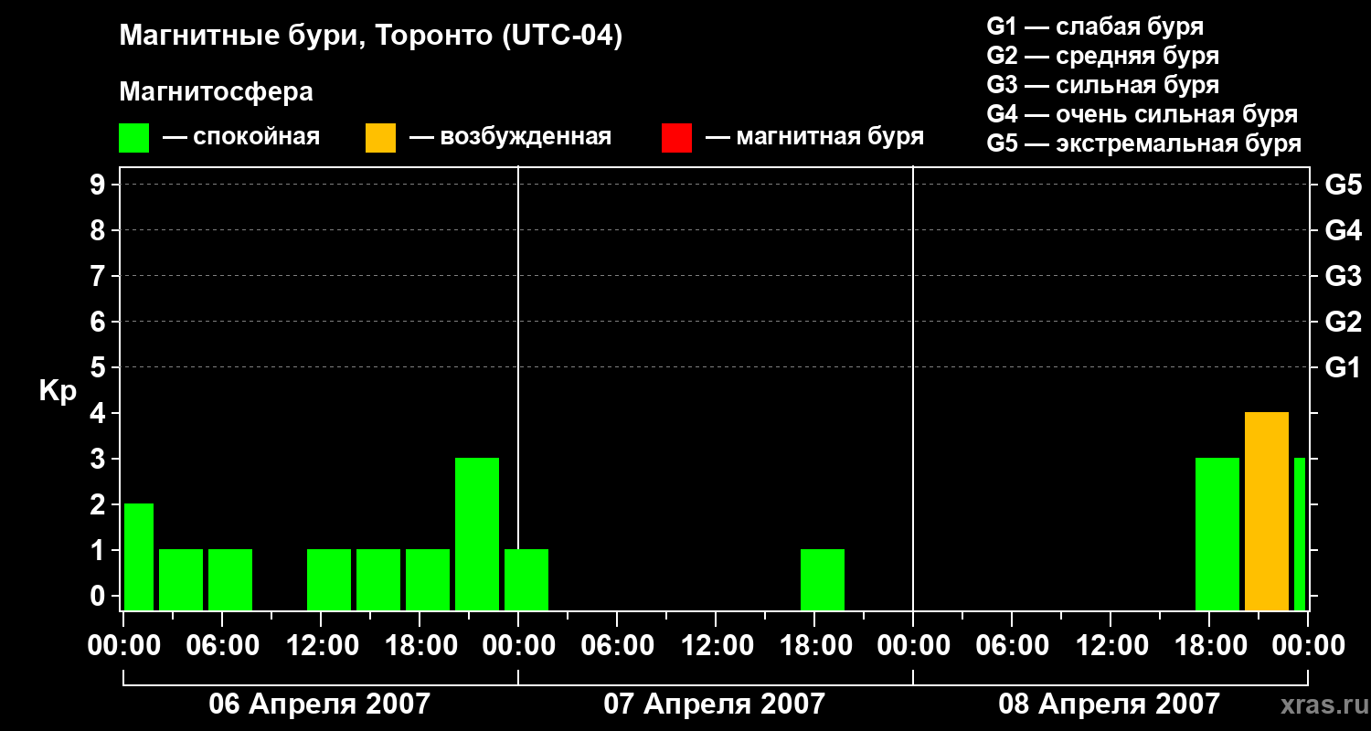 Изменения геомагнитного индекса Kp с 6 по 8 апреля 2007 года для средних широт
