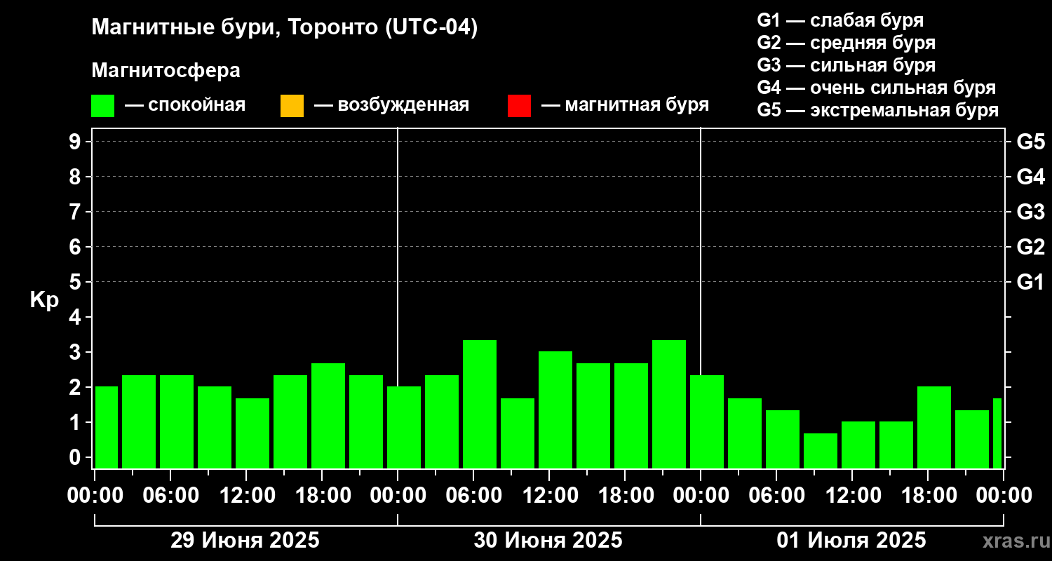 Изменения геомагнитного индекса Kp с 29 июня по 1 июля 2025 года для средних широт
