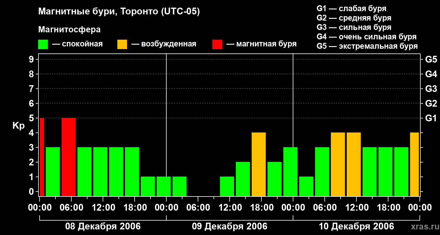 Изменения геомагнитного индекса Kp с 8 по 10 декабря 2006 года для средних широт