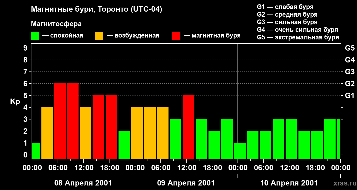 Изменения геомагнитного индекса Kp с 8 по 10 апреля 2001 года для средних широт