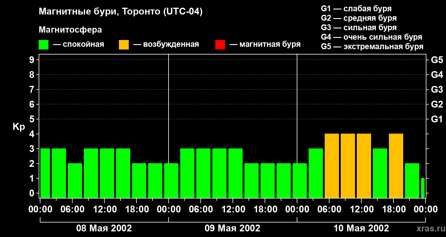 Изменения геомагнитного индекса Kp с 8 по 10 мая 2002 года для средних широт