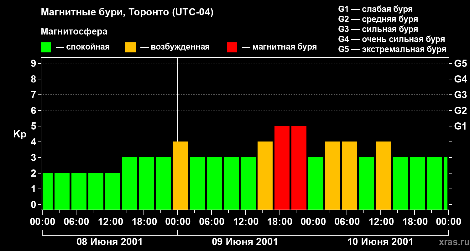 Изменения геомагнитного индекса Kp с 8 по 10 июня 2001 года для средних широт