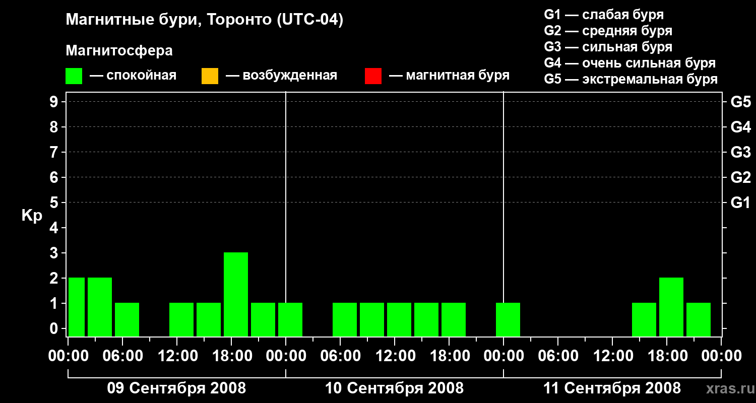 Изменения геомагнитного индекса Kp с 9 по 11 сентября 2008 года для средних широт