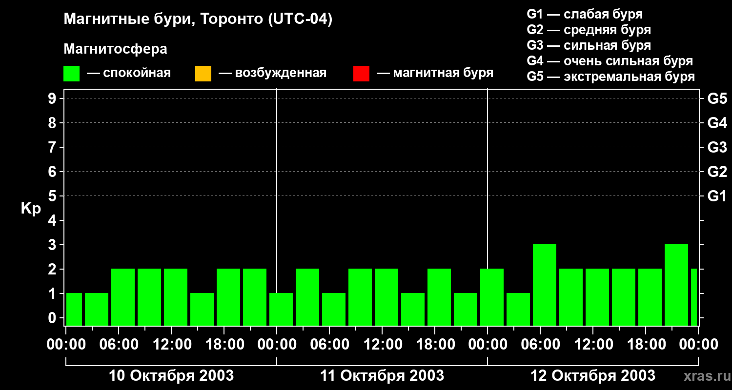 Изменения геомагнитного индекса Kp с 10 по 12 октября 2003 года для средних широт