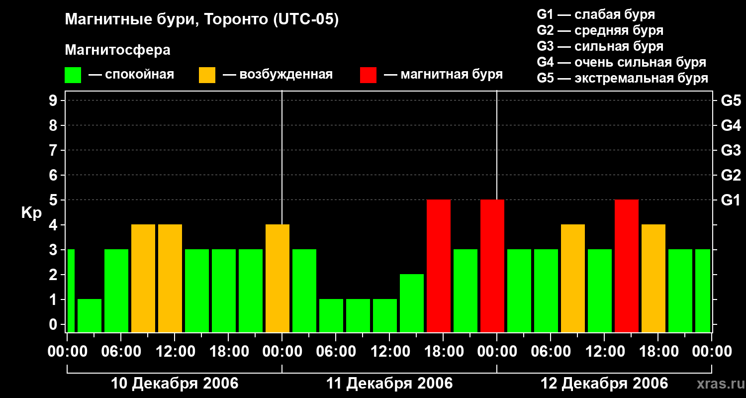 Изменения геомагнитного индекса Kp с 10 по 12 декабря 2006 года для средних широт