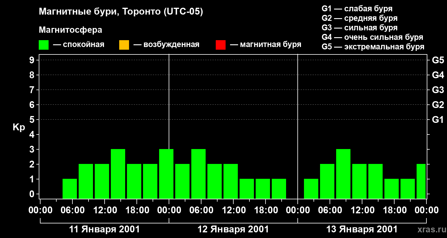 Изменения геомагнитного индекса Kp с 11 по 13 января 2001 года для средних широт