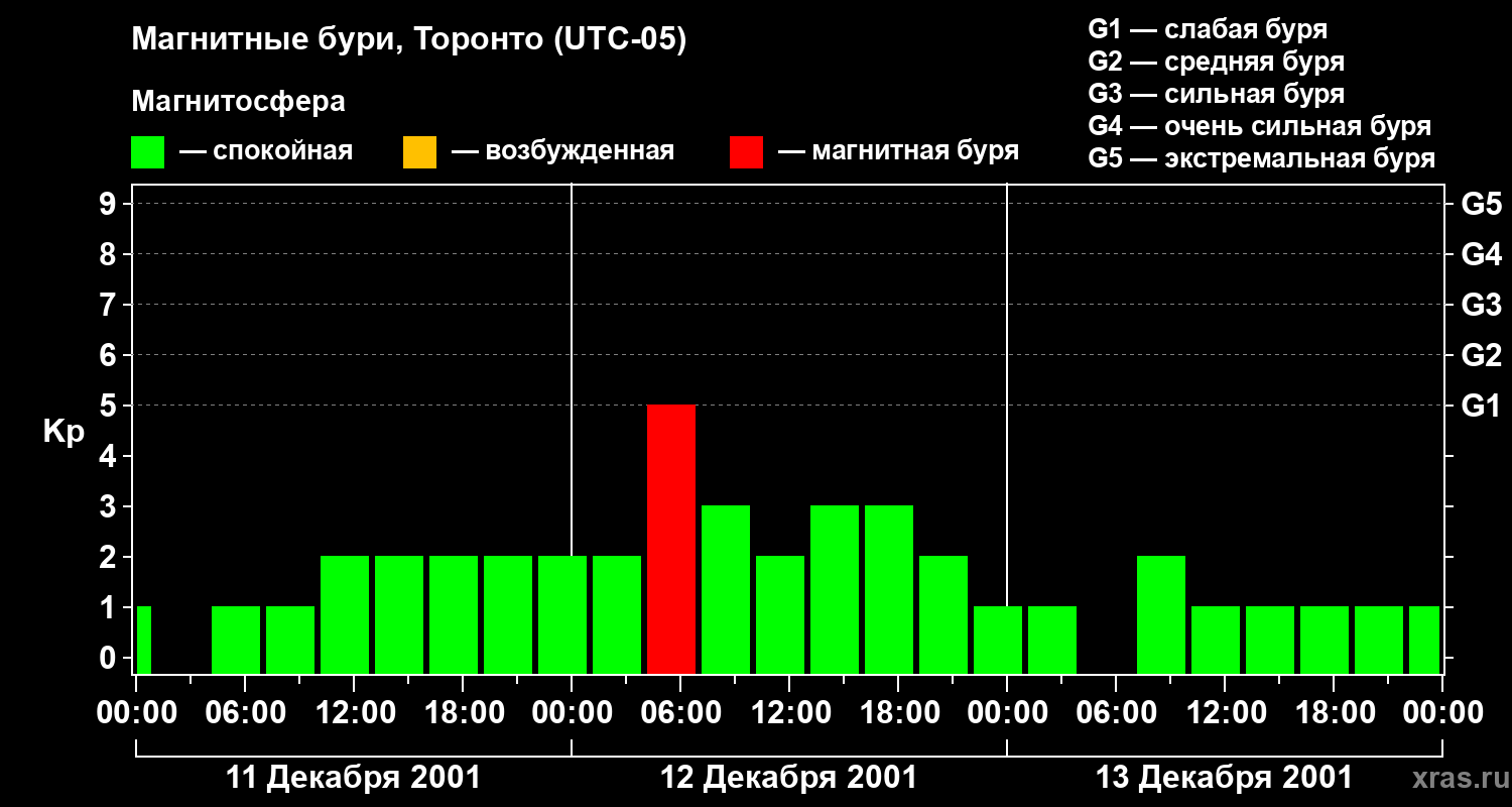 Изменения геомагнитного индекса Kp с 11 по 13 декабря 2001 года для средних широт