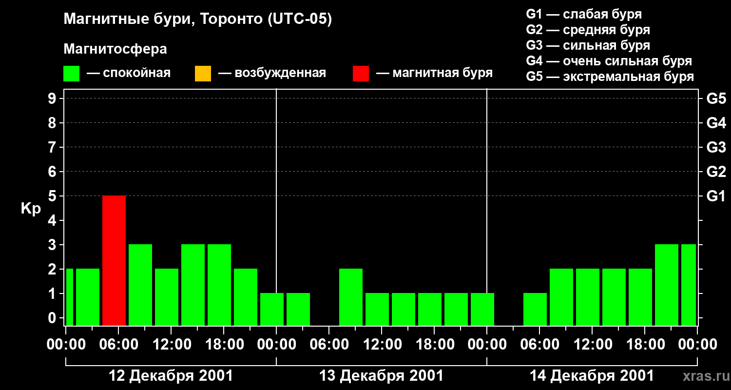 Изменения геомагнитного индекса Kp с 12 по 14 декабря 2001 года для средних широт