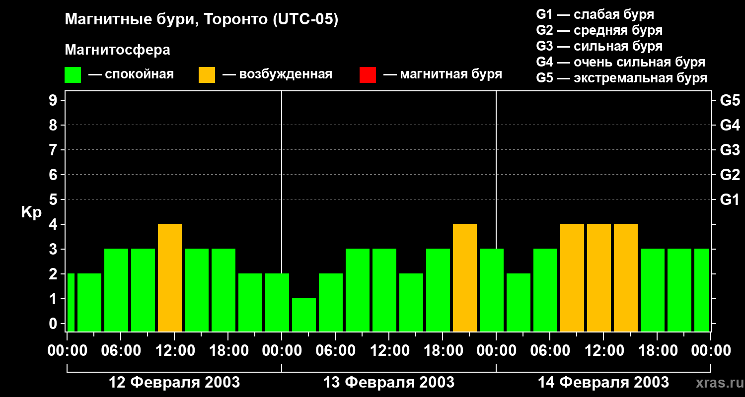 Изменения геомагнитного индекса Kp с 12 по 14 февраля 2003 года для средних широт