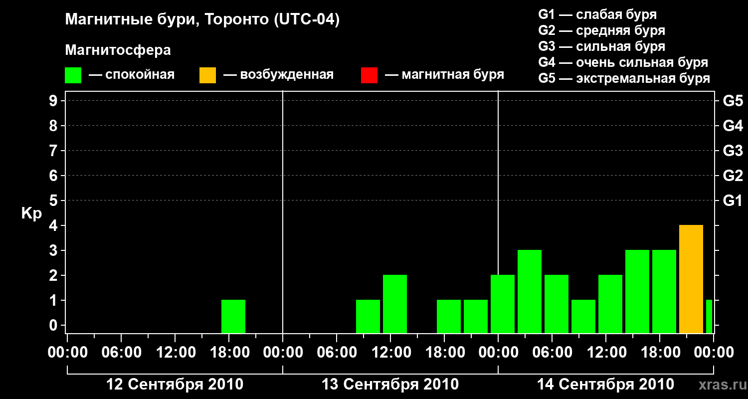 Изменения геомагнитного индекса Kp с 12 по 14 сентября 2010 года для средних широт