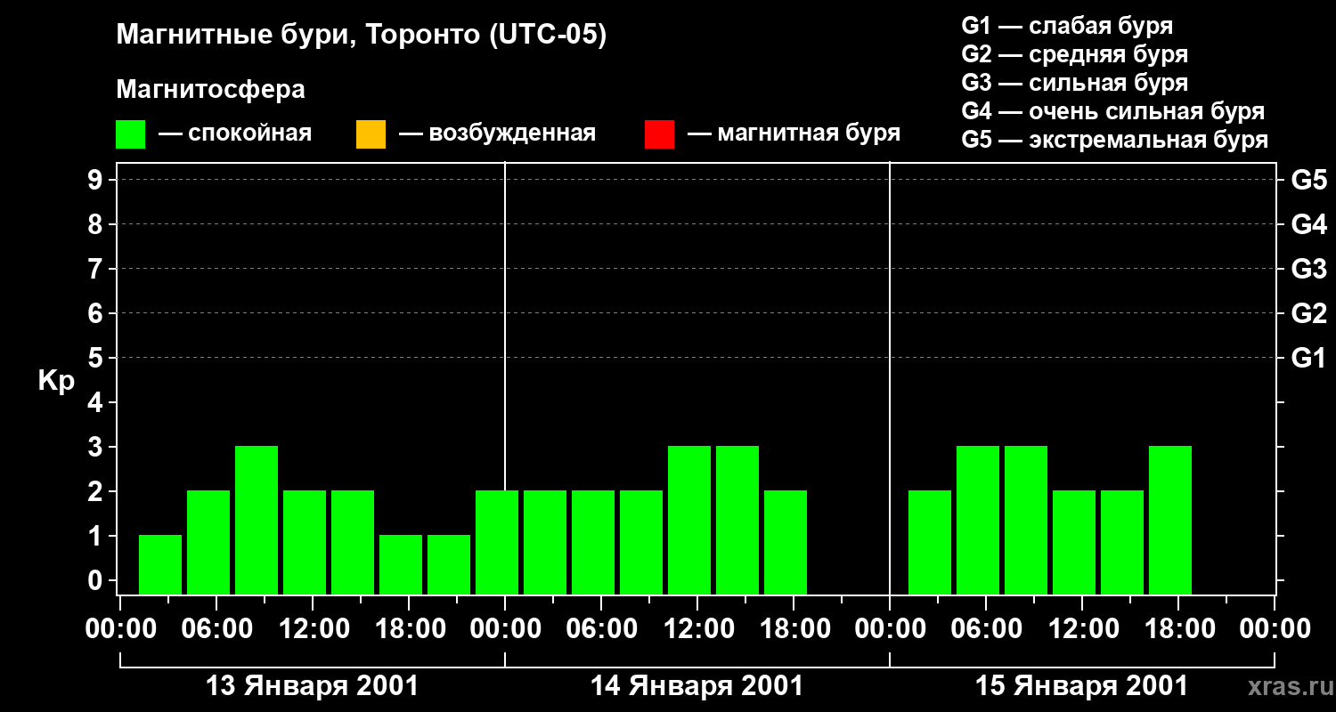 Изменения геомагнитного индекса Kp с 13 по 15 января 2001 года для средних широт