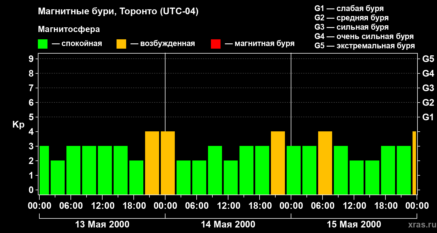Изменения геомагнитного индекса Kp с 13 по 15 мая 2000 года для средних широт