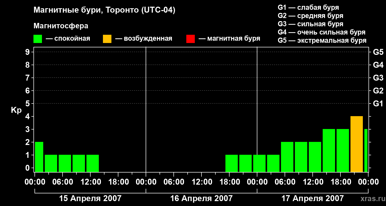 Изменения геомагнитного индекса Kp с 15 по 17 апреля 2007 года для средних широт