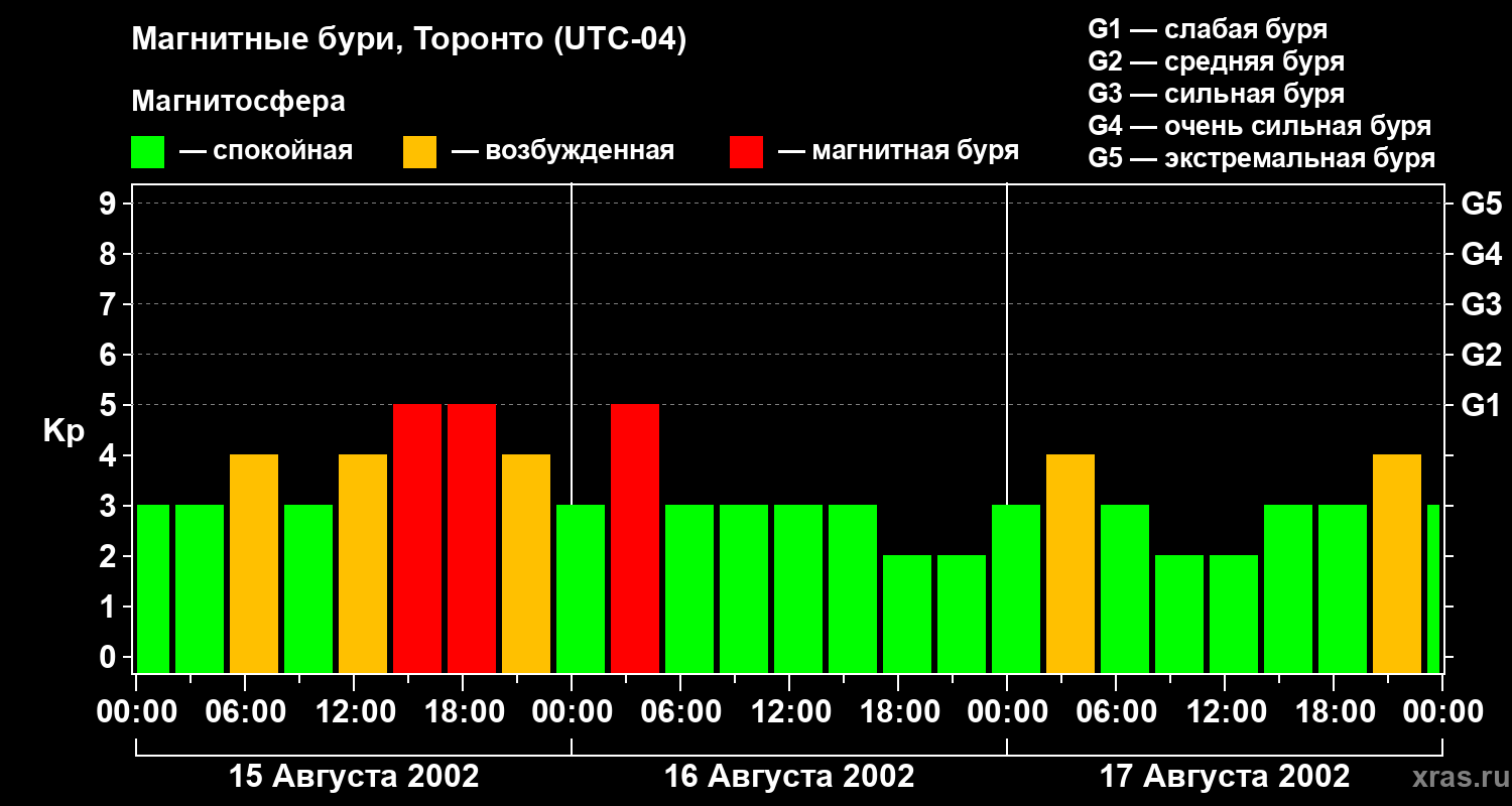 Изменения геомагнитного индекса Kp с 15 по 17 августа 2002 года для средних широт