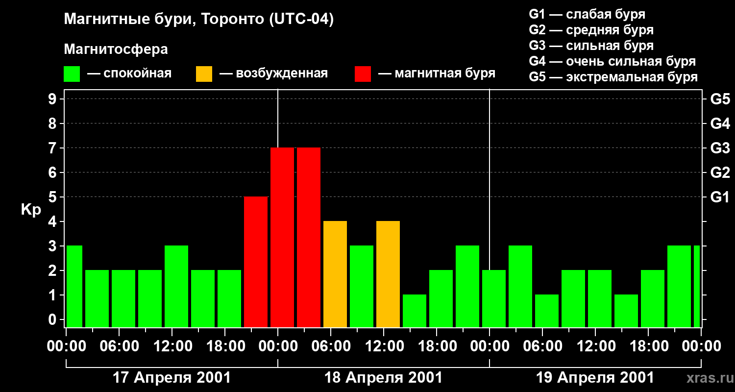 Изменения геомагнитного индекса Kp с 17 по 19 апреля 2001 года для средних широт